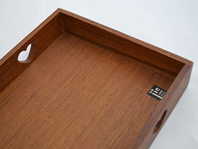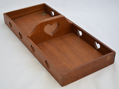 | Jie Verkstad, Sweden チーク製 トレイ 34.8×15.3cm 高さ:7cm 仕切りがついた長方形のチークトレイ。 中央のハンドル部分や、側面にハート型の 型抜きがほどこされた可愛いデザインです。 自然な木目を生かした温かみあふれる仕上りです。 Jieといえば陶器のイメージがありますが、もともとは 1940年代に木工製品の製造からスタートしています。 チーク表面に軽い使用感が見られますが、 全体的に良い状態を保っています。 |