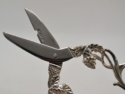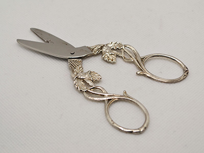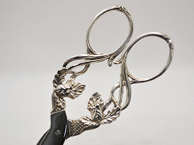 | Gewe, Sweden 葡萄用ハサミ ニューシルバー&ステンレス 11.6×4.7cm 銀製品やジュエリーなどを手掛けた スウェーデン南部の工房が手掛けたフルーツ用はさみ。 刃の部分にはステンレスが用いられています。 装飾部分の素材はニューシルバー(銀メッキ)ですが この商品は本物の銀製品に近い見た目と質感です。 軽い使用感がありますが全体的に良好な状態です。 (※ 紙などを切る通常のはさみとしては使えません) |