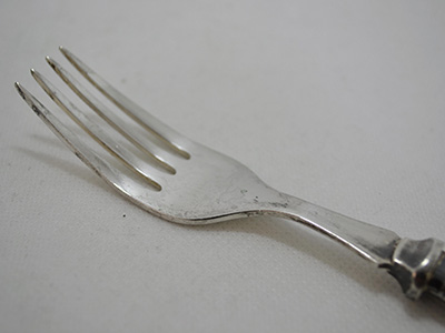 | J. Sanderson, Sheffield, England カトラリー・セット マザーオブパール・ハンドル フォーク:17.5×2.4cm スプーン:19.2×3.8cm ナイフ:21×1.8cm ハンドル部分に真珠母貝を使ったエレガントなカトラリー。 フォーク、スプーン、ナイフがそれぞれ2本のセットです。 (ハンドル部分は幅1.4cm、厚み0.6cm) フォークとスプーンの先端&装飾部分は銀メッキ ナイフは先端がステンレス、装飾部分が銀メッキです。 (ARGYLE EPNS ENGLANDの刻印) 銀メッキ素材部分にスクラッチや黒ずみが見られますが ヴィンテージ品としてはそれなりに良好な状態です。 |