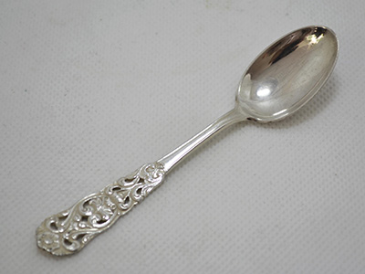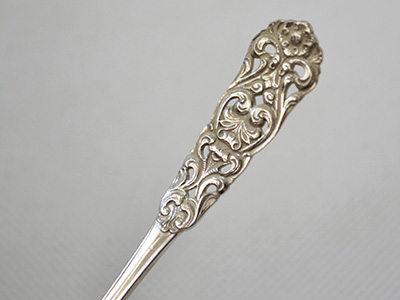 | スプーン4本セット ノルウェー製 ニューシルバー 10.1×2.1cm 優雅な花模様の透かし装飾が施されたスプーンセット。 素材のニューシルバー(Nysilver)は銀のような質感と 手頃な価格帯で19世紀後半から広く流通しました。 軽いスクラッチなどの使用感がありますが 全体的には良い状態を保っています。 |