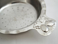 持ち手の部分にエンボス加工のある茶漉しと受け皿のセットです。