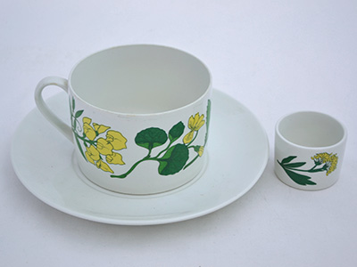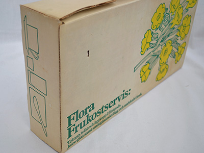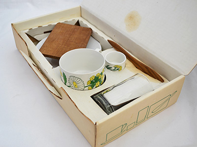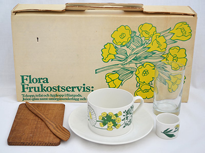 | Flora Frukostservis 朝食セット ノベルティ ボックス入り セット内容: カップ&ソーサー(カップ直径:8.8cm 高さ:6cm、ソーサー直径:16.5cm) エッグカップ(直径:4.3cm 高さ:3.2cm)、 グラス(直径:6cm 高さ:10.5cm) チークプレート(15×9.6cm)、 バターナイフ(17.3cm) デザイン: Carl Arne Breger マーガリン・ブランド「Flora」のノベルティーグッズとして作られた朝食セット。 フルセットが当時のオリジナル・ボックスに入っています。 特に目立つ使用感はありませんが、販売用として作られた 商品ではないため、全体的に作りが少々粗いようです。 箱は日焼け・経年による変色や使用感・傷が目立ちます。 チーク表面のオイル仕上げによる染みが紙に見られます。 |
