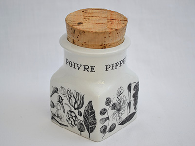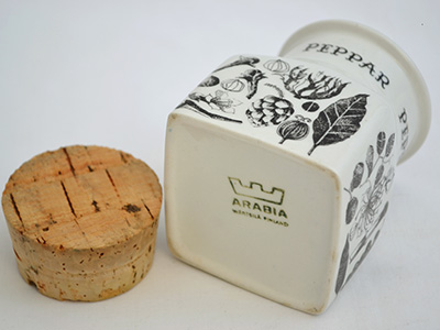 | Arabia, Finland Pepper スパイスジャー コルクつき デザイン: Ulla Procope, Esteri Tomula 6.2×6.2cm 高さ:7.9cm (サイズにコルク含まず) モノトーンでスパイスが描かれたコルクつきジャー。 フィンランド語、スウェーデン語、英語、フランス語で スパイス名のペッパーと書かれています。 底のマークは1971-75年に使用されていたタイプです。 全体的に目立つ使用感の無い、良好な状態です。 |