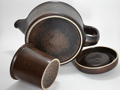 | Arabia, Finland Ruska ティー・ポット デザイン: Ulla Procope 底直径:15.5cm 高さ:12cm 注ぎ口からハンドルまで:23.5cm 1960年代から2000年までの長い期間にわたり製造された アラビアの人気シリーズRuskaからティー・ポット。 1点ごとに微妙に異なる色の混ざり具合など シンプルながらも独特な世界観を感じさせます。 今回入荷分はポットの底にマークが残っています。 茶こしのふち部分に小さなへこみがあります。 (一番下の写真参照) 全体的には使用感の少ない良好な状態です。 |