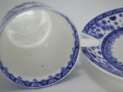 | Gustafsberg (Gustavsberg), Sweden カップ&ソーサー Eklof 1901−1910年 カップ 直径:6.5cm 高さ:6cm ソーサー 直径:12.5p 銅板転写でコバルトの絵付けを施した フローブルーのカップ&ソーサー。 柄のずれや深い青の滲みなどがありますが 古いものならではの少々いびつな完成度も 独特な味わいをもたらしています。 裏のスタンプはスペルがGustafsbergになっています。 この時代の陶磁器には英国や大陸の影響が色濃く見られ、 「スウェーデンらしさ」を追及するのはもう少し後になります。 カップ内側に製造時に生じた小さな突起、 ソーサー中央には細かなスクラッチがありますが 古い時代のものとしては比較的良い状態です。 |