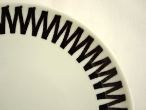 すっきりとした白い磁器に黒いインパクトのあるギザギザがプリントされたプレート。