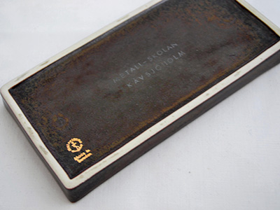 | Gustavsberg, Sweden Lagunシリーズ Metall-Skolan Skavsjoholm デザイン: Sven Jonson 15.3×7.5×1.5cm ストーンウェア素材のLagunシリーズにシルクスクリーン技法で 銀彩のデコレーションが施された長方形のディッシュ。 シルバーで描かれているのはストックホルムエリアにかつて存在した 金属工芸組合の教育施設(現在は会議施設)です。 銀彩部分が酸化し軽く黒ずんでいますが、 落ち着いた色味のブルーとマッチして良い雰囲気に感じられます。 側面の一部に隆起した箇所がありますが 他は特に目立つダメージや使用感の無い良好な状態です。 |