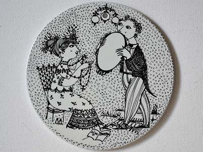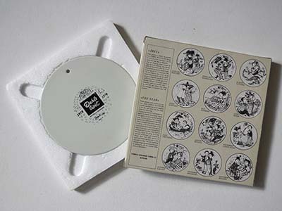 | Nymolle, Denmark Saison Start ウォールプレート デザイン: Bjorn Wiinblad 1973-74年 直径:15cm ウインブラッドのエキゾチックなタッチで新しい季節を シックな装いで迎える男女の姿が描かれた壁掛けプレート。 衣装やアクセサリーにこだわりが表れ、モノトーンでありながら 色鮮やかな作品に劣らない華やかさが感じられます。 プレートの上部に飾り用の穴があります。 企業用ノベルティとして作られたものですが マンスリー(カレンダー)プレートの9月と同じデザインです。 プレートの裏面には企業のロゴが加えられています。 今回入荷分はオリジナルの箱に入っています。 裏側には各月のモチーフとタイトルが添えられています。 箱に軽い黄ばみや傷みが見られます。 |