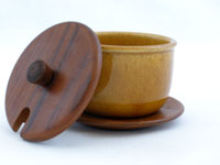 マスタード色のボウル、チーク製のフタとトレイが組み合わさったセット。