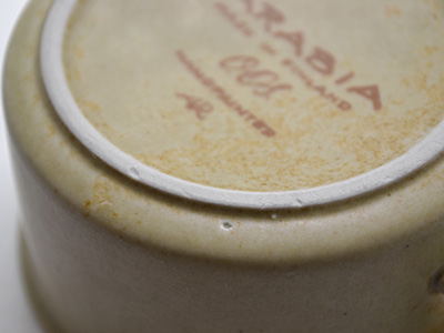 | Arabia, Finland Tunturi ティー・カップ&ソーサー、プレート デザイン: Ulla Procope, Olga Osol カップ 直径:10cm 高さ:5.2cm ソーサー 直径:16.5cm プレート 直径:20cm マットな質感の表面に茶色い花が躍動感のあるハンドペイントで 描かれたTuntriシリーズのトリオ・セット。 Ruskaなどでもお馴染みのU. ProcopeデザインのSモデルに Olga Osolがデコレーションを担当しています。 カップにはペインターのイニシャルが入っています。 ソーサーやプレートに突起やピンホール、 カップ側面の突起や底の窪みなど 製造過程で生じた跡がところどころに見られますが 未使用と思われるとてもきれいな状態です。 |