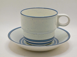 | Gustavsberg, Sweden Dart コーヒー・カップ&ソーサー ボーンチャイナ デザイン: Stig Lindberg カップ 直径:7.5cm 高さ:6.5cm ソーサー 直径:12.8p リンドベリが後年に手がけたDartシリーズより ボーンチャイナ製のコーヒー・カップ&ソーサー。 ブルーグレーのラインで飾ったシンプルなデザインに カップを重ねて収納できる機能性を兼ね備えています。 Dartシリーズにはストーンウェアとボーンチャイナの ふたつの異なる素材が存在します。 今回入荷したコーヒー・カップ&ソーサーは リンドベリのBrun LinjeやLindaシリーズなどと 同じBLモデルとなります。 ソーサーにごくわずかな使用感がありますが 全体的には良好な状態を保っています。 |