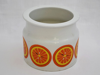 | Arabia, Finland Pomona オレンジ ふたなし 傷あり デザイン: Raija Uosikkinen 直径:9.8cm 高さ:8.5cm オレンジがプリントされたジャムポット。 1960年代らしいヴィヴィッドな色使いと 瑞々しい可愛らしさが感じられるデザインです。 底周辺に小さな欠けや部分的な薄い変色が ところどころに見られるほか、 側面の口近くに小さなひっかき傷があります。 またオレンジ柄プリント部分には 細かな色のロスが見られます。 |