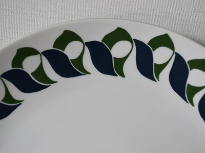 | Rorstrand, Sweden Ditte プレート 直径:21cm 濃いブルーとグリーンでお皿のまわりを プリント装飾したDitteシリーズ。 羽を広げた小鳥や植物など、捉え方によっては 色々なものに見える不思議でレトロなデザインです。 プレート表面のごくわずかなスクラッチ以外は 特に目立つ使用感の無い良好な状態です。 |