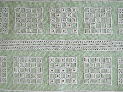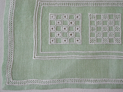 淡いグリーンの麻布に白い糸で装飾を加えた作品。