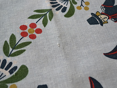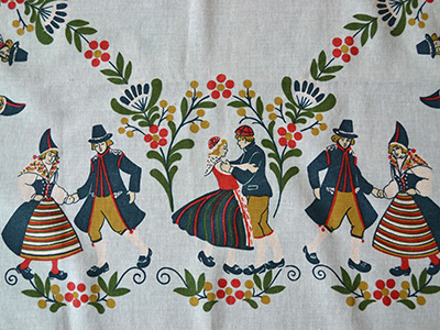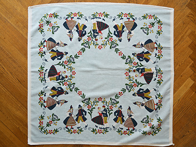 | テーブルクロス フォークダンス デザイン: Inger A 93×88cm フォークダンスに興じる民族衣装姿の男女の姿が 花模様と共に描かれたテーブルクロス。 素朴で温かみのある古き良きスウェーデンを感じさせます。 四隅の一角にInger Aのサインが入っています。 プリントの色は比較的きれいに残っていますが、生地の一部に わずかな傷みや極小の穴が見られます。 |