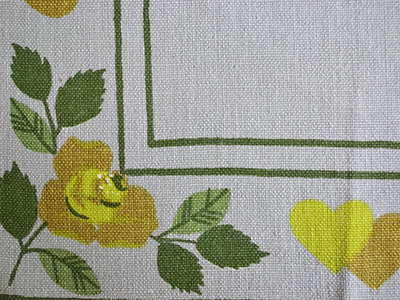 | ハンドプリントクロス 黄色いバラ スウェーデン デザイン: May Buhler 29×28cm 薔薇の花とハート模様を描いたハンドプリントクロス。 レトロで温かみのある可愛らしさです。 季節のテキスタイルやテーブルクロスなど数多く手がけた May Buhlerのデザインです。 わずかに色落ちしている可能性がありますが 生地には目立つ汚れ等の無い良好な状態です。 |