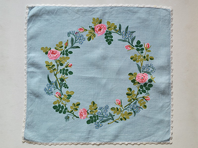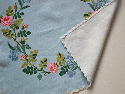 | Jobs, Sweden ハンドプリントクロス デザイン Gocken Jobs 44×42cm 野ばらとワスレナグサが描かれたヨブスのクロスです。 ふち部分にはレースがトリミングされています。 リース模様の中にG Jobsのサインが潜んでいます。 生地の一部に筋状の盛り上がりがあります。 (一番下の写真、右側部分参照) 洗濯などによりわずかに色が薄くなっているようですが 全体的には良好な状態です。 |
