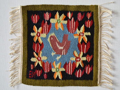 | フレミッシュ織 小鳥とチューリップ スウェーデン デザイン: Kerstin Mauritzson 横24.5×縦25センチ +フリンジ約4cm 小さな小鳥のまわりを花が取り囲んだフレミッシュ織。 伝統柄作品から取り入れたモチーフですが 現代的なポップさを感じさせるデザインです。 作品左下にアルファベットが入っています。 ゆがみの無い非常にきれいな仕上がりです。 |