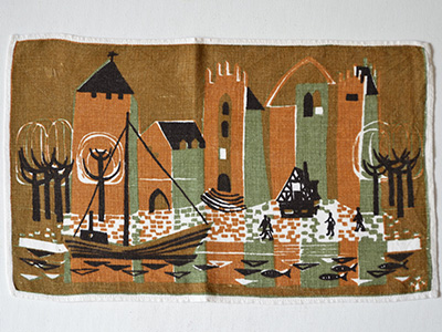 | ハンドプリントクロス 海辺の街 40×24cm 海に面した古い街がハンドプリントされたクロス。 中世時代の建物が映る水辺には魚が優雅に泳いでいます。 ハンドプリントならではの色の重なりの微妙なずれも 風景に独特な味わいをもたらしていると思います。 色むらなどが見られますが、全体的には 比較的良好な状態を保っています。 |