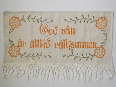 | アーヌーボー刺繍 タペストリー Jugendbroderi 歓迎の言葉 横:61cm 縦:25cm +フリンジ約9cm 麻の布になだらかなアールヌーボー調の字体で 親しい友人をもてなす言葉が刺繍されたタペストリー。 "God van ar alltid valkommen" 「良き友はいつでも歓迎します」 麻布のざっくりとした風合いと、糸で埋め尽くしたステッチの コントラストが独特な世界観を作り上げています。 文字入りの刺繍タペストリーは1900年代初期に 図案と材料がセットになった手芸キットが販売開始された事で スウェーデン人家庭の定番アイテムになったそうです。 経年のため表面の糸の色が褪せているほか、 裏にはピン止めによる小さな錆跡が見られます。 フリンジ部分の長さに不揃いな部分があります。 ある程度の年季は感じられますが、 古いものならではの良い趣を醸し出しています。 |