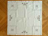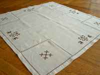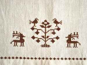 白い布にブラウンの糸でクロスステッチのモチーフが刺繍されたテーブルセンター。
