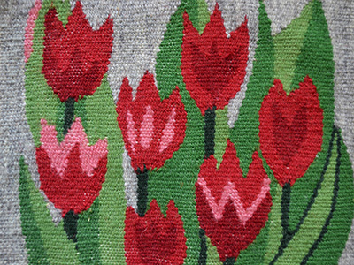 赤いチューリップを描いたフレミッシュ織作品。