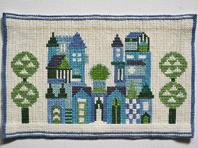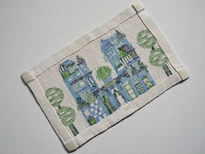 街の様子をトゥヴィスト刺繍で描いたタペストリー。