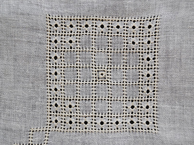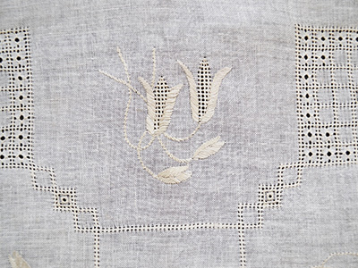 | 刺繍テーブルクロス ドロンワーク 79×79cm アイボリーカラーの薄い麻布に ドロンワーク刺繍を施したテーブルクロス。 花のデザインと幾何学的な模様の組み合わせです。 控えめで清楚な雰囲気に仕上がっています。 おそらく未使用と思われるきれいな状態です。 ※ 柄を強調するため下に敷いた黒い色のため、 写真では生地の色がくすんで見えますが、 実際はステッチ部分と同調の色合いです。 |