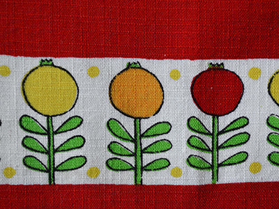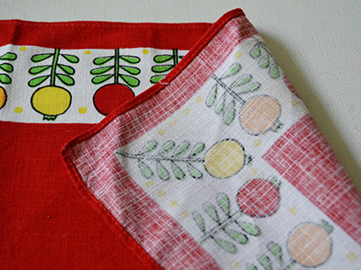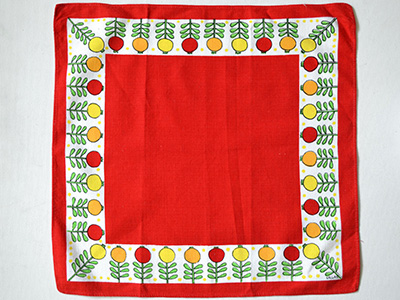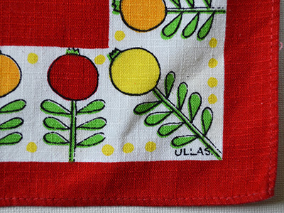 | Ullas, Sweden ハンドプリントクロス デザイン Ulla Scheuer 40×38cm レトロで可愛らしい雰囲気の植物が連続模様で ハンドプリントされた赤いクロス。 1950年代のポップな雰囲気が感じられます。 四隅の一角にULLASのサインが入っています。 未使用ではありませんが、色合いも良く 全体的にきれいな状態を保っています。 |