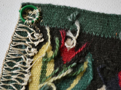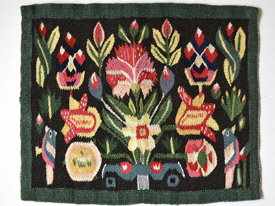 | フレミッシュ織 スコーネ南西部の伝統柄 Oxie Krukan スウェーデン 横37.5×縦32cm カラフルな糸で織られた伝統柄のフレミッシュ織作品。 比較的大きなサイズのため迫力があります。 花や小鳥の姿を描いたフレミッシュ織は スコーネ南西部に伝わる伝統的な題材として 各地に古い作品が残されています。 この作品はOxieの古い大型クッションの 柄の一部分を取り上げたものです。 織の表面に若干の波打ちが感じられますが 全体的にはきれいに仕上げられています。 裏面上部には壁に飾るための リングが2か所に取り付けられています。 |