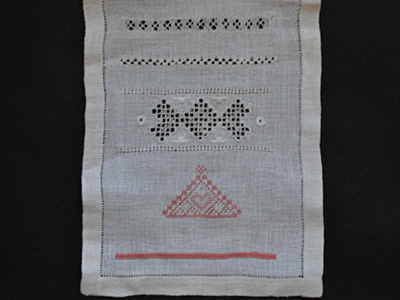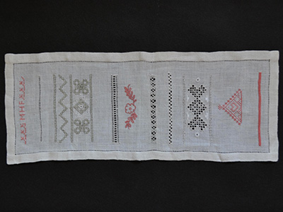 | サンプラー スコーネ地方の刺繍 横18.5×縦45.5センチ 刺繍技法の練習用として作られたサンプラー。 クロスステッチやヘムステッチの他にも スウェーデン南部・スコーネ地方に伝わる 伝統刺繍なども含まれています。 上部にイニシャル(MHF)の刺繍入りです。 それなりに古い作品と思われますが 特に目立つ汚れやダメージはありません。 濃い色の生地を下に重ねたり、 額装して飾るのもおすすめです。 |