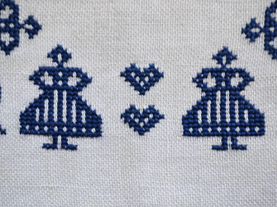 民族衣装の女性の青いクロスステッチ。