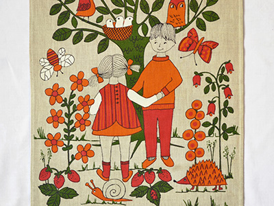 | Ullas リネン・タペストリー ハンドプリント スウェーデン 横32×縦59cm デザイン Ulla Scheuer 1950年代後半から80年代まで テキスタイルデザイナーとして活躍したU. Scheuerの ファンタジーに満ちあふれたイラストが ハンドプリントされたリネン・タペストリー。 上下部分は32.5センチの木棒で固定され、 上部には飾り用のフックがついています。 右下部分にUllasのサインが入っています。 生地全体にうっすらとした黄ばみが見られるほか、 少年の足元とハリネズミの間に薄い汚れがあります。 ヴィンテージとしてはそれなりに良好な状態です。 |
