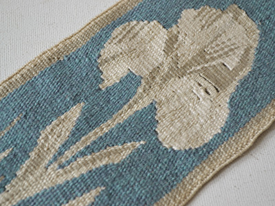 | フレミッシュ織 アイリス スウェーデン デザイン: Maaru Uotila 11×32.5センチ 白やアイボリー系の色糸を用いてアイリスの花を 控えめな印象に仕上げた細長いフレミッシュ織作品。 グレートーンのブルーが花のまわりを取り囲み 淡く儚げな世界観を醸し出しています。 裏面の糸は内側にまとめられています。 ゆがみの無いとてもきれいな仕上がりです。 |